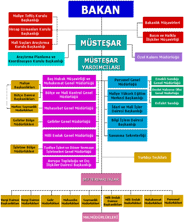 § Defterdarlık § Gelir Müdürlükleri § Vergi Dairesi Başkanlıkları § Vergi Dairesi Müdürlükleri § Muhasebe Müdürlüğü § Saymanlık Müdürlükleri § Milli Emlak Dairesi Başkanlığı § Milli Emlak Dairsi Müdürlükleri § Muhakemat Müdürlüğü § Personel Müdürlüğü § Eğitim Merkezi Müdürlüğü