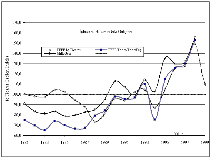 Buradan, imalat sanayi ve TEFE genel endeksine göre hesaplanan iç ticaret hadlerinin birkaç yıl dışında, tarım aleyhine sanayi lehine geliştiğini görmekteyiz. Ayrıca, lehine değiştiğinde düşük, aleyhine değiştiğinde ise yüksek oranda tarım aleyhine değişme olması dikkat çekicidir. Bunun yanında, trend denklemleri, imalat sanayi fiyat endeksine göre hesaplanan iç ticaret hadlerinin, genel endekse oranla daha büyük oranda tarım aleyhine geliştiği görülmektedir. Dolayısıyla, bu veriler, tarımdan sanayie aktarılan kaynağın, diğer sektörlere oranla daha fazla olduğunu ortaya koymaktadır[30].
