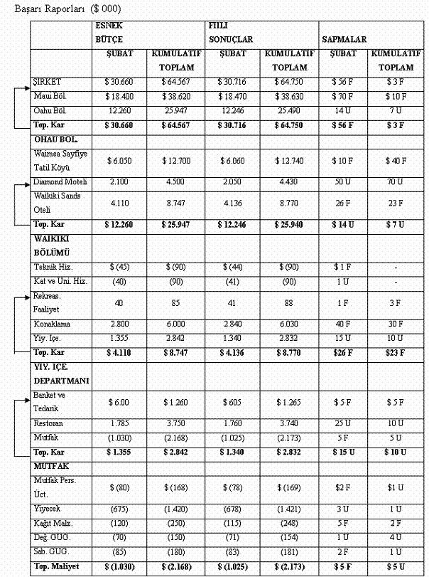 Not : “F” olumlu sapmaları,”U” da olumsuz sapmaları simgelemektedir. Çizelge 3, Aloha Oteller Zinciri’nin farklı alt bölümleri için şubat ayı başarı raporları arasındaki ilişkiyi göstermektedir. Çizelgede, parantez içerisinde gösterilen değerler, ilgili bölümün yani maliyet merkezinin yapmış olduğu giderleri işaret etmekte, diğer veriler ise kar ya da yatırım merkezlerinin elde ettiği karları ifade etmektedir. Burada Maui Bölümü, Ohau bölümü ve tüm şirket bir yatırım merkezi niteliği kazanmakta, diğer alt bölümler ise ya bir maliyet ya da bir kar merkezi olarak karşımıza çıkmaktadır. Çizelge 3’deki başarı raporları arasındaki ilişkiye dikkat edildiğinde, mutfak kısmı en düşük düzeydeki bir alt bölümdür ve başarı raporu da çizelge 2’de gösterilenle aynıdır. Çünkü, mutfak alt bölümü, daha doğrusu mutfak maliyet merkezi, yiyecek-içecek kar merkezinin bir alt bölümü olmaktadır. Mutfak, restoranlar, banket ve tedarik bölümlerinden elde edilen $1.355.000’lık kar da Waikiki bölümünün yiyecek-içecek kar merkezinden elde ettiği kar rakamlarını oluşturmaktadır. Aynı şekilde, Waikiki Bölümü, Ohau Bölümü’nün bir alt bölümü yani Ohau Bölümü’ne bağlı bir kar merkezi olduğundan, Waikiki Bölümünün $4.110.000’luk karı Ohau Bölümü’nün başarı raporundaki toplam karın bir kısmını oluşturur. Ayrıca, Ohau Bölümü’nün bir alt bölümü, yani Ohau yatırım merkezi, Aloha Otelleri ve Tatil Köyleri A.Ş.’nin bir bölümü olduğundan, elde etmiş olduğu, $12.260.000’lık kar da şirket karının bir kısmını teşkil etmektedir. Böylece, Maui ve Ohau bölümlerinden elde edilen $30.660.000’lık kar da şirket karını oluşturmaktadır. Görüldüğü üzere, veriler, başarı raporları aracılığıyla, hiyerarşik bir sıra takip ederek tepe yöneticisine kadar çıkmaktadır. Bahsedilen bu ilişkiler, çizelge 3’deki oklar takip edilmek sureti ile daha iyi anlaşılabilecektir. Çizelge 3’deki başarı raporu, aynı zamanda, bütçelenmiş başarı ile fiili başarı arasındaki sapmaları gösterir. Örneğin, şubat ayında, mutfak maliyet merkezi için $1.030.000 olarak bütçelenen giderlerin $1.025.000 olarak gerçekleşmesi, $5.000’lık olumlu bir sapmayı belirtir ve bu durum, aşçıbaşının başarısı olarak değerlendirilir. Oysa, kat hizmetleri ve üniformalı hizmetler departmanının şubat ayında bütçelenmiş olduğu $40.000’lık giderinin, $1.000 olumsuz sapmayla $41.000 olarak gerçekleşmesi ise, ilgili yöneticinin standart altı başarısını gösterir. Eğer bu sapma, departman yöneticisinin kontrol edebildiği bir sapma ise, yani bu sapmaya yöneticinin kararları neden olmuş ise, sorumlu, kendisi olmaktadır. Eğer, kontrol edilemeyen bir nedenden kaynaklanmış ya da önemsiz bir sapma ise ilgili yöneticiye bu konuda hesap sormak gereksiz olacaktır. Esnek bütçedeki sapmalar, başarı tespiti ve sorumluluğun belirlenmesinde yöneticiye yardımcı olur. Bu raporlar, genel müdüre, otel başarısını yükseltmede, çalışanların motive edilmesinde ve gelecek faaliyetlerin planlamasında da yardımcı olacaktır. Bu analizler sonucu çıkarılan kontrol grafikleri ile sapma dereceleri belirlenir ve düzeltici eylemin alınması zamanlı olarak sağlanmış olur. Sonuç olarak, bütçelenen ile gerçekleşen miktarlar arasındaki fark ne kadar olumlu bir sapma şeklinde gerçekleşiyorsa, verimlilik o kadar artacak, ortaya çıkan farklar ne kadar olumsuz bir durumu yansıtıyorsa, verimlilik o derece azalacaktır.
