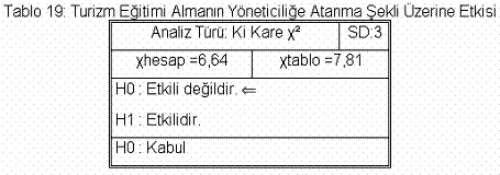 χ² analizi sonucuna göre, turizm eğitimi almış olmak yöneticiliğe atanma üzerinde etkili olmamaktadır. Turizm eğitimi almış veya almamış olan yöneticilerin, işletme içinden terfi ederek, aynı yönetim kademesindeki başka işten geçerek veya kendi işletmesini kurarak yöneticiliğe atandığı görülmektedir. Ancak, veriler incelendiği zaman, hem turizm eğitimi alarak, hem de kendi işletmesini kurarak yöneticilik yapanların sayısının çok az olduğu göze çarpmaktadır. Turizm eğitimi almış olanların çoğunluğu başkasının işinde yöneticilik yapmaktadır.