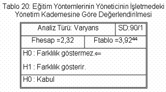 Yöneticilerin eğitimlerinde faydalı olan eğitim yönteminin yöneticinin işletmedeki yönetim kademesine göre farklılık göstermediği görülmektedir. Orta ve üst kademe yöneticilerin çoğunluğu, iş başı eğitim yöntemlerinin kendileri için daha faydalı olduğunu belirtmektedir. Teoriye göre, yönetimde üst kademelere doğru çıkıldıkça iş dışı eğitim yöntemlerine ve soyut bilgilere ağırlık verilmekte iken, anket sonuçlarına göre seyahat acentalarında bunun tam tersinin söz konusu olduğu görülmektedir. Bu durum, turizm sektörünün hizmet sektörü olmasından ve tüm personelin hizmet üretiminde etkin rol almasından kaynaklanmaktadır.