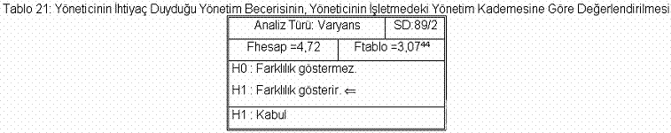 Varyans analizine göre, orta ve üst kademe yöneticilerin ihtiyaç duyduğu yönetim becerilerinin yönetim kademesine göre farklılık gösterdiği görülmektedir. Teoriye göre, her kademe yöneticinin ihtiyacı olan yönetim becerileri birbirinden farklı olmaktadır. Alt kademe yöneticilerde teknik becerilere ihtiyaç fazla iken, üst kademelere doğru gidildikçe analitik beceriye olan ihtiyaç daha fazla olmaktadır.[44] Yönetim kademesi ne olursa olsun yöneticilerin beşeri becerilere ihtiyacı bulunmaktadır.