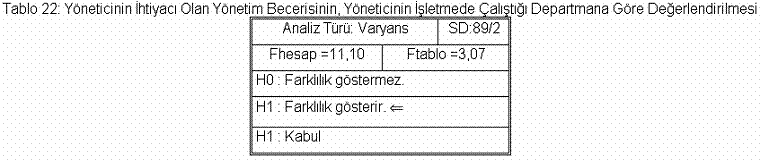 Varyans analizi sonucuna göre, ihtiyaç duyulan yönetim becerisinin yöneticinin çalıştığı departmana göre de farklılık gösterdiği görülmektedir. Turların organizasyonundan sorumlu operasyon yöneticisi koordinasyon becerisine, pazarlama yöneticileri daha çok beşeri becerilere, muhasebe bölümü yöneticileri ise daha çok teknik beceriye ihtiyacı olduğunu belirtirken, ofis müdürlerinin çoğunluğu ise, koordinasyon becerisi ve beşeri beceriye ihtiyacı olduğunu belirtmektedir. En üst kademe yönetici olan ofis müdürlerinden teknik beceriye ihtiyaç duyan bulunmamaktadır.