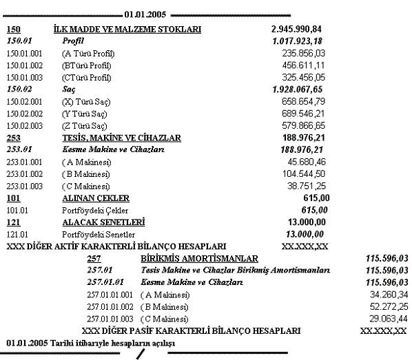 “Özel Tüketim Vergisi” kapsamına giren mallar için düzenlenen fatura veya fatura yerine geçen belgelerde KDV uygulamasından farklı olarak her bir mal için ayrı ayrı Özel Tüketim Vergisi (ÖTV) yukarıdaki formata uygun şekilde hesaplanabilir. 01.01.2005 tarihinden itibaren ödeme aşaması ve işlem sonuçlarında kullanılacak en küçük para birimi “1 YKr” olacağı için, hesaplanan vergiler de en az “1 YKr” olacaktır. Hesaplanan verginin Yarım YKr altında olması durumnda, bu vergi dikkate ve hesaplara alınmayacaktır. Ancak, hesaplanan vergi Yarım YKr ve üzerinde ise, 1 YKr’a tamamlanacaktır.[15] Öte yandan işletmeler, dönüşüm sonrası itibari kıymeti toplamı 1 YKr altında olan “Hisse Senedi ve Menkul Kıymetler”ini “1 YKr” olarak izleyebileceklerdir. YTL uygulaması ile birlikte yeni yılda, bazı mal ve hizmetlerin birim fiyatları 1 YKr’un altında olabilecektir. Bu nedenle alt toplam, vergi matrahı ve fatura toplamında Kanun’da[16] belirtilen tamamlama ve 1 YKr esaslarına uyulması şartıyla, mal veya hizmetlerin 1 YKr altındaki birim fiyatlarının fatura detaylarında ya da diğer belgelerde gösterilmesi mümkün olabilecektir. Mükellefler 1 YKr’un altındaki birim fiyatlarını veya tarifelerini internet, basın ve diğer kanallarla tüketicilere duyurulabilecektir. 4.2.2. İşlemeye (Süreçleme) İlişkin Yapılması Gerekenler MBS çerçevesinde girdi aşamasından sonraki aşama olan “İşleme (Süreçleme)” aşamasında 01.01.2005 tarihinden sonraki süreci ve yapılması gerekenleri örnekler yardımıyla açıklamaya çalışacağız. Bilindiği gibi MBS’nde, 31.12 tarihi itibariyle düzenlenen bilanço, o dönemin dönem sonu bilançosunu ve ertesi yılın başındaki açılış bilançosunu ifade etmektedir. Bu çerçevede hesapların ilgili dönemin sonunda (31.12) kapatılabilmesi için yapılan kapanış kaydının tersi de, bir sonraki dönemin (01.01) açılış kaydını ifade etmektedir. O halde 31.12.2004 tarihinde “TL” olarak yapılan kapanış kaydının 01.01.2005 tarihi itibariyle gerekli dönüştürme işlemleri yapıldıktan sonra “YTL” olarak yapılması gerekmektedir. Bu açılış kaydını 31.12.2004 tarihi itibariyle eski dönem için yaptığımız kapanış kaydının tersi olarak aşağıdaki gibi yapabiliriz. Bu kayıt için gerekli dönüştürme işlemleri “EK-1” ve “EK-2”de sunduğumuz MS Excel modeli yardrımı ile gerçekleştirilebilir.