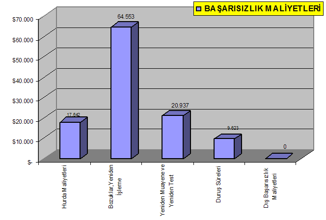 - Başarısızlık  maliyetleri toplamı 112.755$ ile toplam kalite maliyetinin %33‘ünü oluşturmaktadır. Yeniden işleme maliyeti de 20.937$ ile başarısızlık maliyetlerinin %18.5‘ unu oluşturmaktadır. Maliyeti yaratan süreç ve işlemlerin incelenerek giderilmesi gerekmektedir.