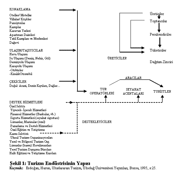 Turizm endüstrisi, tarım ve sanayi gibi diğer endüstrilerden girdi alan ve hizmet bankacılık ve ticaret gibi sektörlere de girdi veren bir endüstri olarak görünmektedir. Turizm endüstrisinin hizmet bağımlılığı ilişkisi de vardır[vii]. Turizm endüstrisi bir bütündür. Bu bütünlük, içinde endüstriyi oluşturan unsurlar karşılıklı olarak birbirlerini etkiler. Birinin başarısı veya başarısızlığı tüm sektörü etkiler[viii]. Talep yapısının doğası nedeniyle turizm; pek çok iş kolu ve değişik aktivitelerden oluşan karma bir endüstridir. Onu oluşturan değişik kısımların birbirleriyle ahenkli bir biçimde çalışması henüz sağlanamamıştır[ix]. Turizm endüstrisi, düzensiz bir biçimde biraraya gelmiş farklı parçaların oluşturduğu karmaşık bir yapıya sahiptir ve bunlar çoğu zaman birbirinden bağımsız olarak çalışırlar. Eğer birlikte çalışıyorlarsa, bu çoğu zaman sınırlı amaçlar içindir. Turistik ürünün bileşik ürün niteliğinde olması ve standartlaştırma yapılması çok azdır[x], özellikleri turizm endüstrisinin yukarıda belirtilen yapısından kaynaklanmaktadır. Gelişen turizm endüstrisi birtakım sorunları da beraberinde getirmiştir. Sorunların önemli bir bölümü endüstrinin kendi yapısından kaynaklanmakta ve gelişme düzeni ile birlikte ortaya çıkmış sorunlardan oluşmaktadır. Pazarlama, planlama, çevre sorunları, turizm endüstrisinin ana sorunlarıdır[xi]. Turizm endüstrisi; konaklama, ulaşım taşıyıcılar, çekiciler, üreticiler, aracılar ve destek hizmeti veren bir çok kurum kuruluşu içine alan bir endüstridir. Turizm endüstrisinin çok parçalı özelliği çok sayıda küçük organizasyonun oluşumuna yol açar. Örneğin A.B.D deki otellerin yaklaşık %40’ını küçük oteller oluşturur ki bu rakam Türkiye için %60’ın üstündedir[xii]. Turizm endüstrisinin yapısı Şekil 1’de gösterilmiştir. Bunlara otobüs ve demiryolu işletmeleri, yolcu gemileri, rezervasyon acentaları faaliyetleri dahildir. Çok parçalı olma özelliği, turizm endüstrisinin çok sayıda küçük organizasyonlardan oluşmasına neden olmaktadır.