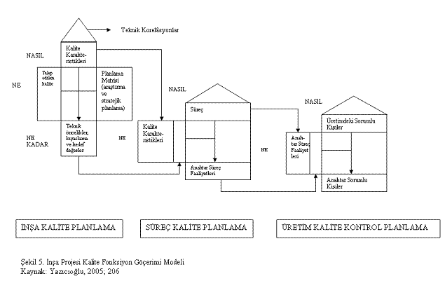 Bu çalışmada, inşa projesi kalite fonksiyon göçerimi modeli olarak, F.Hilal Halıcıoğlu’nun (27) 11. Uluslar arası Kalite Fonksiyon Göçerimi Sempozyumundaki bildirisinde yer olan model kullanılmıştır. Bu modelde, kalite fonksiyon göçerimi parça planlamayı içermemektedir. Çünkü inşaat projelerinde parça planlama bulunmamaktadır. Parça planlama üretim işletmelerinde kullanılan bir safhadır. Bu model aşağıdaki şekilde gösterilmiştir.