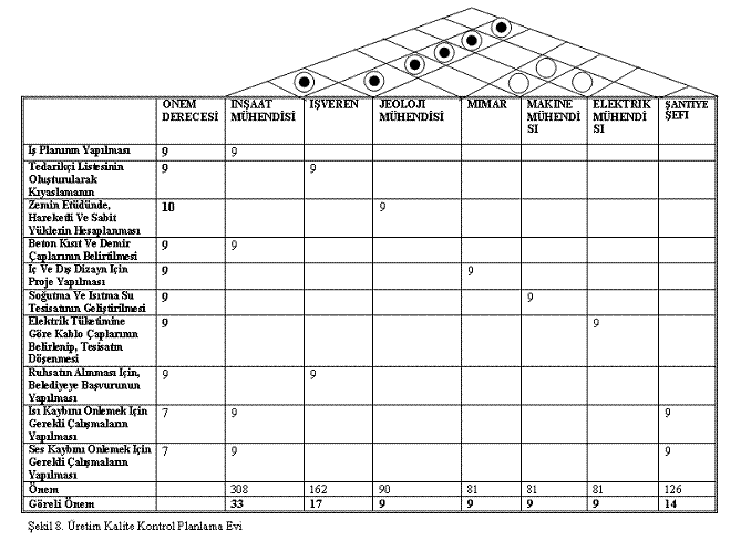 İnşaat sektörü ve bu sektördeki uygulamalar insan sağlığı ve güvenliği açısından önemlidir. İnşaat izninin alınabilmesi için yer etüdü çalışmaları ve binanın yapımında kullanılan malzemeler yanında müşterinin konforunun sağlanabilmesi açısından bir takım yeni özelliklerin bulunması gerekmektedir. Bu çalışmada inşaat olarak bir evin yapımı incelenmiştir. Evin inşası için gerekli tasarım özellikleri belirlenerek, kalite karakteristikleri, süreç karakteristikleri belirlenmiştir.