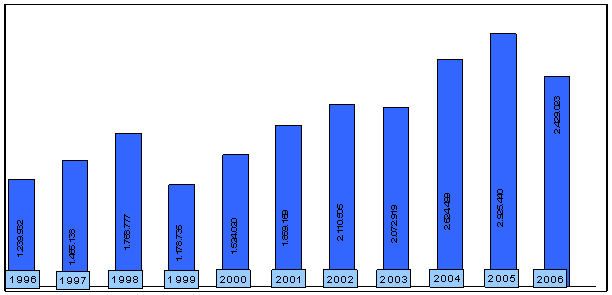 Grafik 1: 1996 – 2006 Yılları Arasında Muğla Hudut Kapılarından Giriş Yapan Yabancı Turistlerin Yıllara Göre Dağılımı