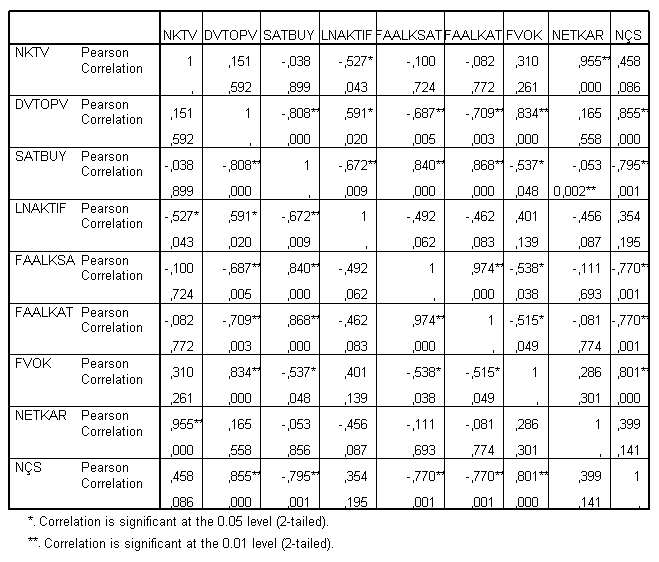 Tablo 3. Firmaya Ait Değişkenlere Uygulanan Pearson Analizinin Sonuçları
