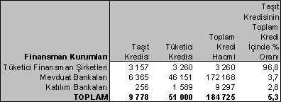 [1] Türkiye Cumhuriyet Merkez Bankası tarafından yayınlanan 22 Şubat 2007 tarihli Basın Bülteni’nde “Tüketici Finansman Şirketleri Kredi Hacmi” verilerinden hesaplanabilir.