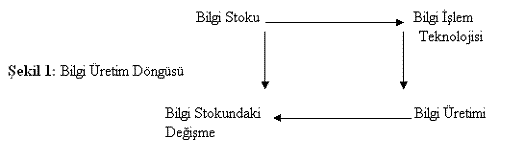 1. BİLGİ VE BİLGİNİN ÜRÜNE DÖNÜŞÜMÜ 1.1. BİLGİTürk Dil Kurumunun Türkçe sözlüğünde bilgi, “öğrenme, araştırma veya gözlem yoluyla elde edilen gerçek” ve “insan zekâsının çalışması sonucu ortaya çıkan düşünce” olarak tanımlanmaktadır. Görüldüğü gibi bilgiyle-düşünce arasında çok sıkı bir ilişki vardır. Duran’ın dediği gibi düşünme, bilgiye ulaşmanın yegâne yoludur. Zira düşünme, olguların betimlenmesine ya da açıklanıp anlaşılmasına yönelik zihinsel işlemler bütünüdür. İnsanoğlunun düşünce dünyasının iki temel öğesi vardır: “Bilinç” ve “bilinçdışı”. Bilinçdışını oluşturan nesneler duyularla algılanır, akıl ile idrak edilir. Bilinçdışı gerçek, nesnel gerçek olarak insan bilincinden bağımsız olan gerçekliktir. Bilincin gerçeği ise göreli gerçektir. İnsan nesnel gerçeğin yansımalarını, duyuları ile algılar aklıyla işler ve onun hakkında göreli gerçekleri oluşturur. Göreli gerçekler, nesnel gerçeğe ne ölçüde uygunsa, o ölçüde doğrudur. İnsanlık, başlangıçtan beri, bir göreli gerçekten, daha doğru, başka bir göreli gerçeğe yaklaşmaya çalışmaktadır. İnsanoğlu, nesnel gerçeği, duyumsal bilgilerden rasyonel bilgilere aktarır, duyumlarını akıl yeteneği ile işler, kavramsal halde ifade ederek bilgiyi oluşturur (İrmiş, 2006: 393). Bilginin gelişim sürecinde mevcut göreli gerçekler bu gün için daha doğru olduğu düşünülen farklı bir göreli gerçeğe dönüşmektedir. Çünkü yeni bilginin, bir öncekinden daha doğru (nesnel gerçeğe daha yakın) olduğunu kanıtlanmıştır (Dura, 2005: 1-2). Gerçeği arama ve bulmanın iki tekniği vardır. Birincisi duyuları, doğayı oluşturan nesnelere yöneltme ve buradan elde edilecek bulgu ve bilgilerin akılda işleyerek rasyonelleştirilmesidir. İkincisi elde edilecek rasyonel gerçeklere, bilgi ve bilimin gereği, kuşkucu ve eleştirici yaklaşarak, başka bir göreli gerçek olduğunu, dolayısıyla ondan daha doğru (nesnel gerçeğe daha yakın) gerçeklerin olabileceğini kabullenmektir. Bu insanoğlunun bilgi stokunu artıracaktır. Yeni bilgilerin elde edilmesinde, artan bilgi stoku yol gösterici olacaktır. Bir göreli gerçekten, başka bir göreli gerçeğe ulaşma, duyuların ve aklın gücünü artırıcı tekniklerin kullanımına bağlıdır (Dura, 2005: 11). Bu tekniklerin başında bilim gelmektedir. Bilim doğadaki ampirik bilgileri sistemli şekilde organize ederek bilimsel bilgilere dönüştürmektedir. Bir başka ifade ile bilim, insanın iç dış evrende meydana gelen olay ve olgulardan gözlenebilir ve ölçülebilir nitelikte olanları akıl yürütme ve aklın yönetimindeki deney yoluyla bilinir hale getirme ve açıklama sürecidir. Bilimsel bilgi bu sürecin çıktısıdır. Bilim süreci kendi çıktısı olan bilgiyi üretirken, sürecin başlamasından önce oluşmuş olan (var olan) ve kabul görmüş olan bilisel bilgiler ile deneyimleri sürece girdi olarak alınır (İrmiş, 2006: 394). Bu bilgilerin pratik amaçla, yani fayda sağlama, insan ihtiyaçlarını karşılamaya yönelik olarak uygulamaya konulmasına teknik adı verilir (Dura, 2005: 41). Bilgiyi insan üretiyor fakat bilgi, insanı sürüklüyor. Bilgi belli süreçlerden geçirilerek teknolojiye dönüşüyor, teknoloji, hayatı yeniden üretiyor. Yemek pişirilen tencereden oturulan eve, küçük bir toplu iğneden bataklıktaki kamışın kâğıt olana kadar geçirdiği merhale, ağrıyı dindirmek için içilen ilaçtan gecenin karanlığında aydınlatmada kullanılan ampule, dünyanın bir ucundan diğer ucunda olanlarla irtibata geçmeyi sağlayan cep telefonları ve MSN gibi görüntülü iletişim sistemlerine kadar hayatın hemen her alanında kullanılan mallar bilginin fonksiyonu olarak ortaya çıkmış gerçeklerdir (Erkut, 2002: 68 ). Yaşam bilgiyle kolaylaşmaktadır. Bilgi bilimsel süreçlerden geçirilerek insan ihtiyaçlarını karşılama ve hayatı kolaylaştırmak için teknoloji şeklinde pratiğe indirgenmektedir. Teknoloji denen bu bilgi demeti sosyo-ekonomik ilerlemenin motoru olmaktadır. Klasik iktisadi düşüncede (sanayi ekonomisinde), ekonomik sorunların nedeni kıtlıktır. Bu yüzden ekonomik çabalarının özünü, kıtlıkla mücadele oluşturmaktadır (Üstünel, 1983: 11). Bu düşünceden hareketle iktisat bilimi kaynakların kıtlığı üzerine kurulmuştur. Bir başka ifade ile kıt kaynakların nasıl ekonomik olarak kullanılacağı üzerine yoğunlaşmıştır. Bilgi çağının ekonomisi ise kıtlığın değil bolluğun nasıl yönetileceği üzerine yoğunlaşmaktadır (Darling, 1999: 8-9). Çünkü bu gün bilgi arzı bilgi talebini aşmıştır. Bilgi fazlası vardır. Bilgi, bol fakat dayanıksız bir üründür. Ayrıca üretim tarihi ile son kullanma tarihi arası çok kısadır. Kullanılmayan bilgi eskimekte, değerini kaybetmektedir. Ancak bilgi kendini yenileme gücüne sahiptir. İkinci özelliği ise yüksek yayılma hızıdır. Bilginin yayılma hızı ışığın yayılma hızına yaklaşır hale gelmiştir. Bilgi kullanıldıkça yayılır, yayıldıkça çoğalır, büyür, çeşitlenir, yeni bilgilerin üretilmesine yol açıyor (Erkut, 2002: 68). Burada üzerinde durduğumuz bilgi “üretken bilgi”dir. Bilimsel düşünce sürecinden geçmiş ve bir üretim aracı olarak kullanılan bilgidir. Aşağıda şekil 1’de bilgi üretim döngüsü verilmiştir. Burada da görüldüğü gibi yeni bilginin üretilmesinde temel kaynak, bir önceki bilgi stokudur. Yani bilgi (bir önceki bilgi), yukarıda da belirtildiği gibi bilgi üretiminin de en önemli girdisini (kaynağını) oluşturmaktadır (Erkut, 69).