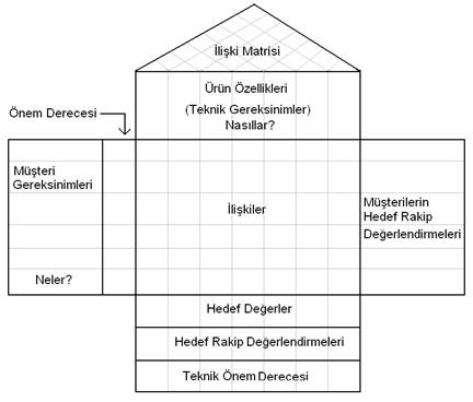 KFY uygulamalarının işleyiş sistemini oluşturan kalite evi matrisinin genel yapısı Şekil 1’de gösterilmiştir (Sandelands, 1994: 37).