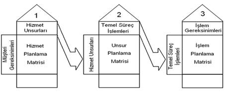 Müşteri istekleri ve hizmet ölçütlerinin karşılaştırıldığı Hizmet Planlama Matrisi, kalite evinin en önemli parçasını oluşturmaktadır. Bu matrisin sonuçları diğer matrislerin girdilerini oluşturduğundan tüm süreci etkilemektedir (Akbaba, 2000: 2). Bu aşama üretim tabanlı KFY’nın ürün planlamasına karşılık gelir. Müşteri gereksinimleri öncelikle belirlenir ve daha sonra, ürün planlamada dizayn gereksinimlerine karşılık gelen hizmet unsurlarıyla ilişkilendirilir (Hwarng ve Teo, 2001: 202).