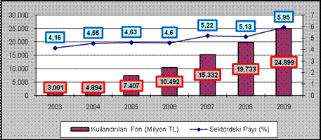 Katılım bankalarının kullandırılan fon büyüklüğü piyasa için önemli bir göstergedir. Grafik 5’te 2003-2009 verilerine bakarak artışın % 830 olduğunu görmek mümkündür. Katılım bankalarınca kullandırılan fon büyüklüğü 2003 yılında 3.001 milyon TL iken 2009 yılında 24.899 milyon TL’ye ulaşmıştır. Katılım bankalarınca kullandırılan fonların Türk bankacılık sektörü içerisindeki payının 2003 yılında % 4,16’dan, 2008 yılında % 5,13’e ve 2009 yılında % 5,95’e ulaştığı görülmektedir.